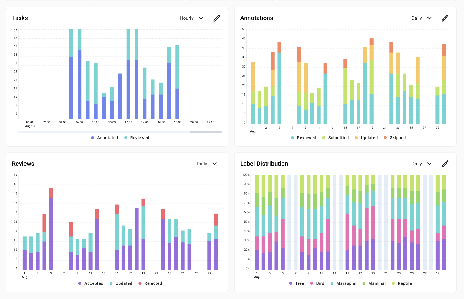 View the status and progress of reviewed and annotated tasks during a specific time range in order to understand if more annotators or reviewers should be assigned to the project.