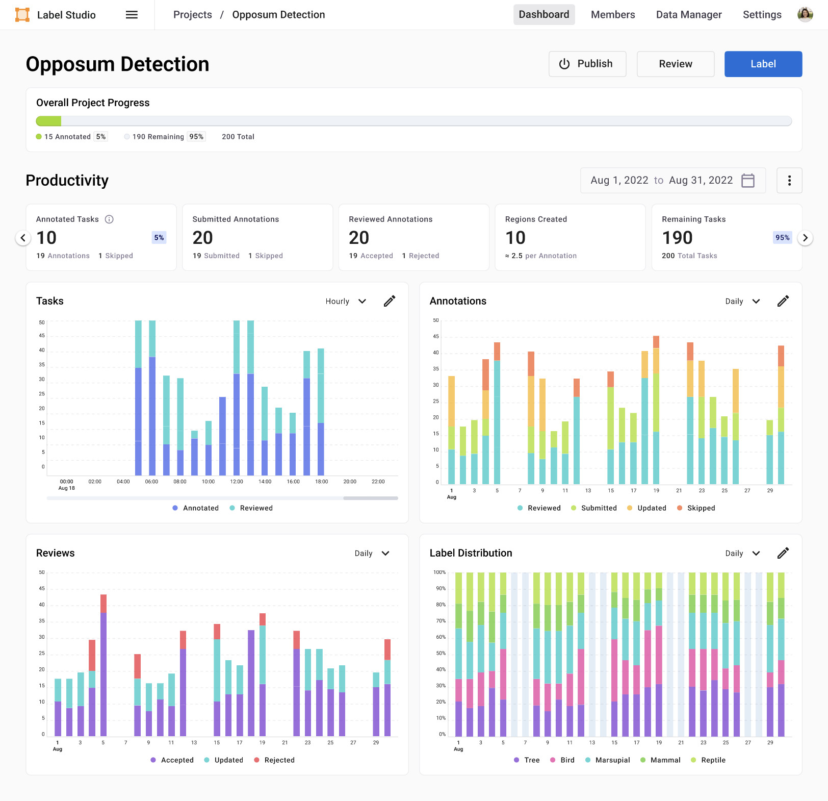 Manage project timelines, improve resource allocation, and update training and instructions to increase the efficiency of your dataset development initiatives. Administrators, organization owners, and workspace managers can access project performance dashboards to gain a better understanding of the team’s activity and progress against tasks, annotations, reviews, and labels for each project.